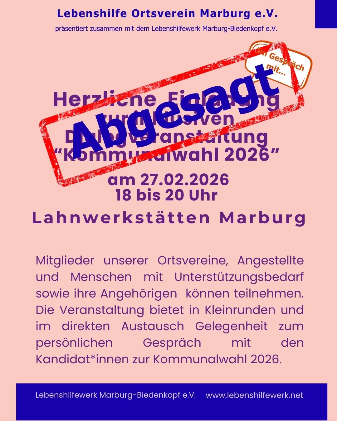 Menschen mit Unterstützungsbedarf, Angehörige, Angestellte und Vereinsmitglieder können an diesem Abend ihre Themen und Anliegen mit Kandidaten für die Kommunalwahlen im Landkreis Marburg-Biedenkopf diskutieren und Fragen stellen.